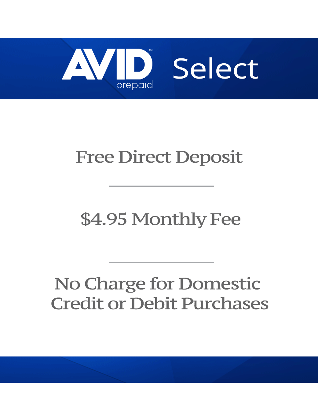 There is an additional charge for the 'Early Access Benefits Direct Deposit feature'. Refer to the Cardholder Agreement's Schedule of Fees and Charges. You are not required to elect this feature and can avoid this fee by choosing to receive your monthly benefits on the effective date either by calling us at (801) 893-7716 or (800) 221-6192 or by email at: contactus@avidprepaid.com or in writing to: Avid Prepaid, PO Box 307, New Hyde Park, NY 11040.